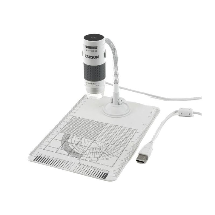 A sturdy suction cup at the end of its 8.5” flexible arm, will allow you to connect your microscope to most flat surfaces or graduated bases, and you can even use it when just holding it in your hand. In addition, its white base has an 8” ruler on one side, a 20cm metric ruler on the other, and a 120x100mm rectangular grid - sectioned into 5mm squares - for detailed specimen measurement.